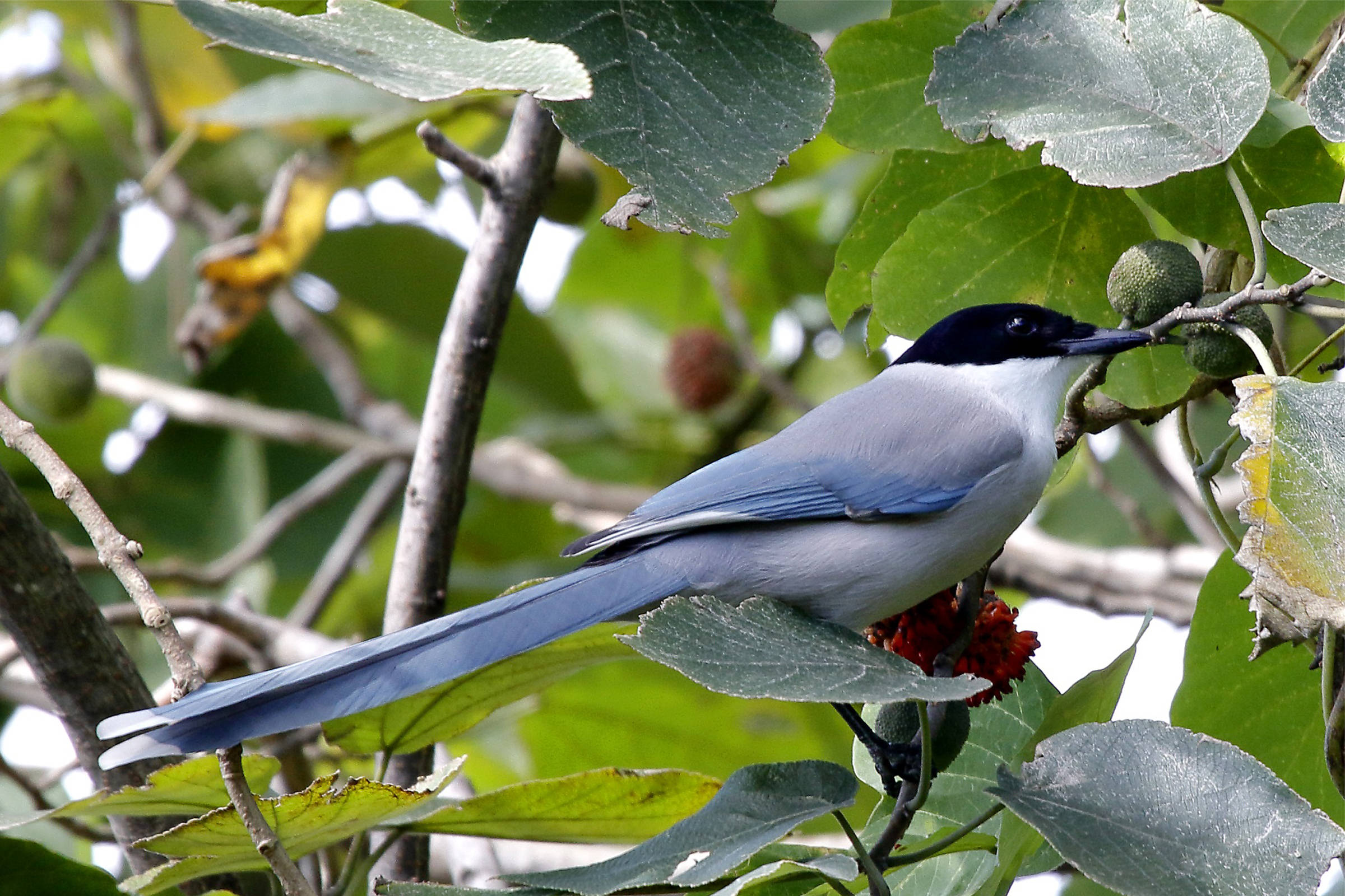 本州の中部以北の山林から住宅地で、通年見られる。翼と尾の淡い青色は、逆光や遠くからではわかりにくいが、黒いベレー帽をかぶったような頭、長い尾は遠目でもわかりやすい。群れでいることが多く、しわがれ声でよく鳴き交わす。