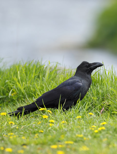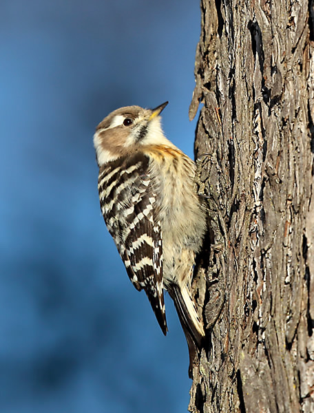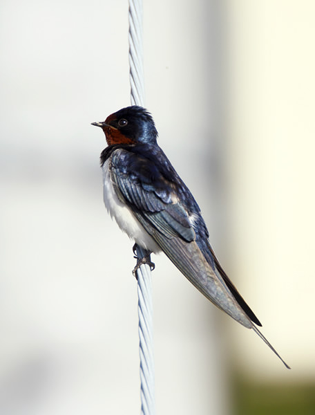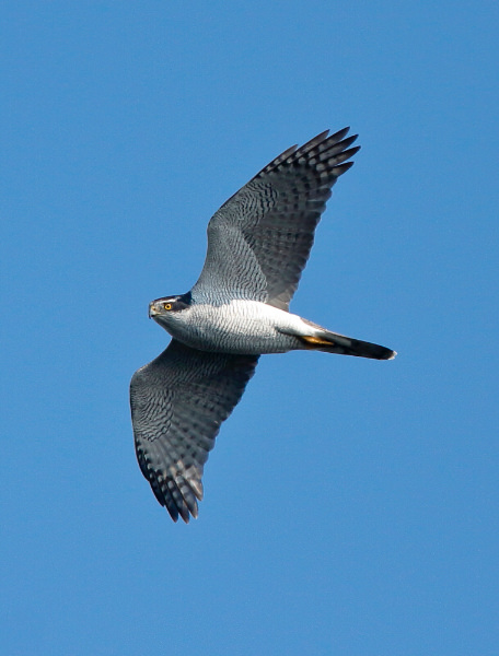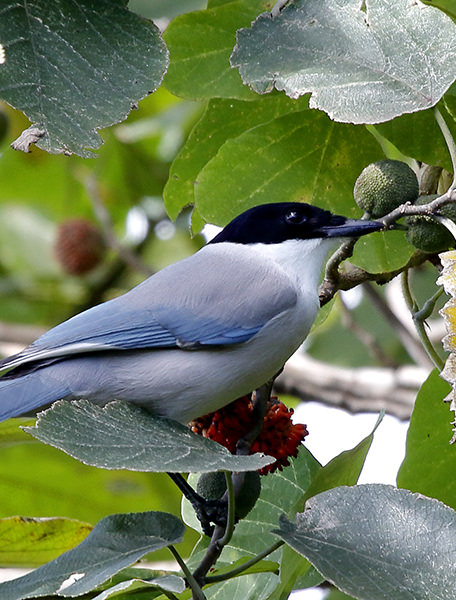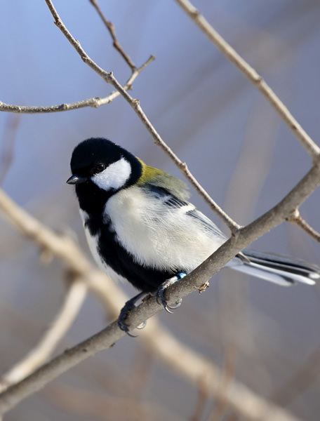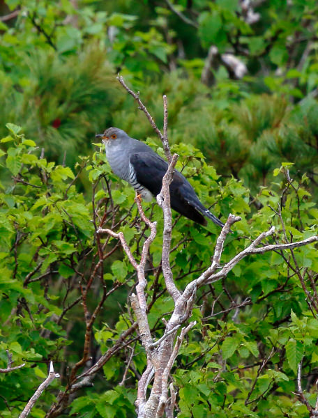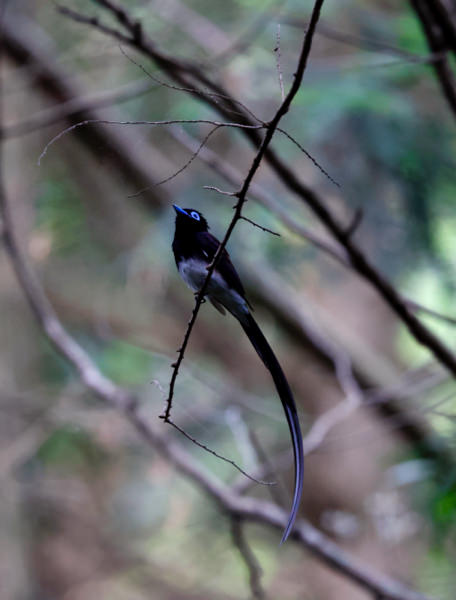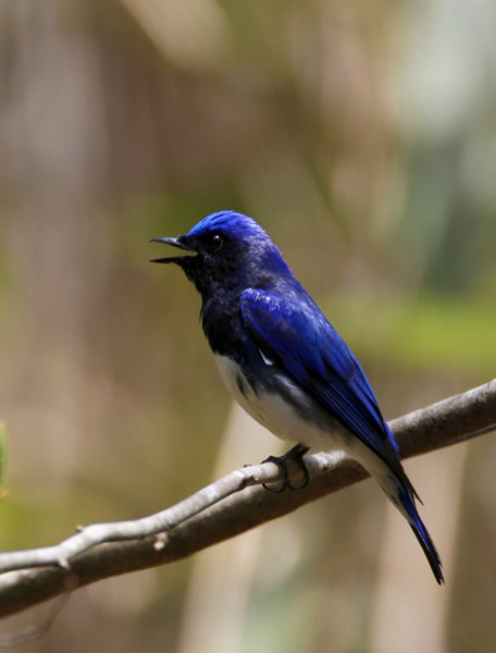 地味なメスはともかく、瑠璃色に輝くオスは簡単に見つけられそうですが、意外にもそうではありません。まずは大きさ。オオルリはスズメと比べてわずかに大きい程度ですから、間近で見なければただの小鳥に過ぎません。また、梢にいるのを下から見上げることが多く、白い腹や黒い胸は見えても青く輝く背はなかなか見えません。一部が見えたとしても、距離や光の具合によっては黒っぽく見えます。葉が茂った山地で見るよりは、早い時期の身近な緑地のほうが見やすいと思いますが、山で青いオオルリを堪能するには、山道を登りながら眼下の梢を探すとよいでしょう。